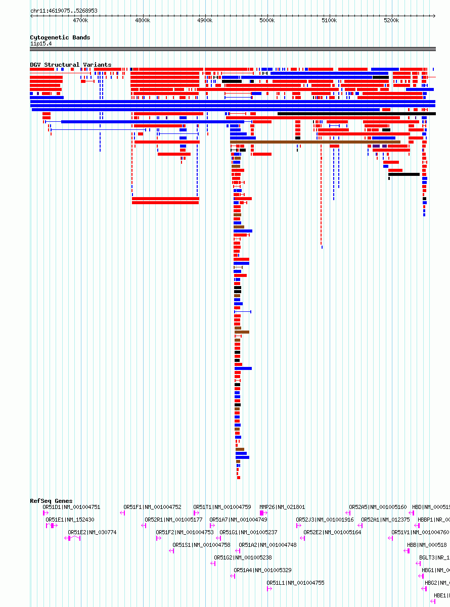 | | Variant Type | CNV duplication | | Copy Number | | | Allele State | | | Allele Origin | | | Probe Count | | | Validation Flag | | | Merged Status | M | | Merged Variants | | | Supporting Variants | nsv6439692, nsv6450577 | | Samples | | | Known Genes | HBB, HBBP1, HBD, HBE1, HBG1, HBG2, MMP26, OR51A2, OR51A4, OR51A7, OR51D1, OR51E1, OR51E2, OR51F1, OR51F2, OR51G1, OR51G2, OR51L1, OR51S1, OR51T1, OR51V1, OR52A1, OR52A5, OR52E2, OR52J3, OR52R1 | | Method | Sequencing | | Analysis | | | Platform | | | Comments | | | Reference | Sedlazeck_et_al_2020 | | Pubmed ID | 99999999 | | Accession Number(s) | dgv958n223