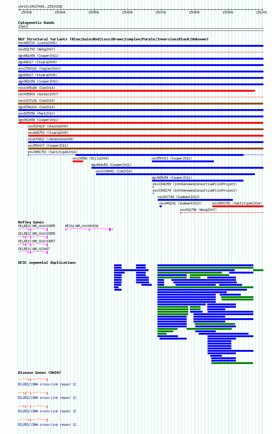 | | Variant Type | CNV loss | | Copy Number | | | Allele State | | | Allele Origin | | | Probe Count | | | Validation Flag | | | Merged Status | M | | Merged Variants | | | Supporting Variants | nsv550003, nsv550006 | | Samples | | | Known Genes | DCLRE1C, MEIG1 | | Method | SNP array | | Analysis | Illumina SNP array copy number analysis | | Platform | Not reported | | Comments | | | Reference | Cooper_et_al_2011 | | Pubmed ID | 21841781 | | Accession Number(s) | dgv963n54