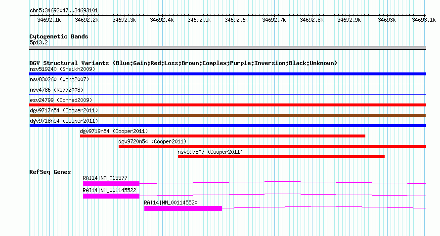 | | Variant Type | CNV gain+loss | | Copy Number | | | Allele State | | | Allele Origin | | | Probe Count | | | Validation Flag | | | Merged Status | M | | Merged Variants | | | Supporting Variants | nsv597803, nsv597800 | | Samples | | | Known Genes | RAI14 | | Method | SNP array | | Analysis | Illumina SNP array copy number analysis | | Platform | Not reported | | Comments | | | Reference | Cooper_et_al_2011 | | Pubmed ID | 21841781 | | Accession Number(s) | dgv9717n54
