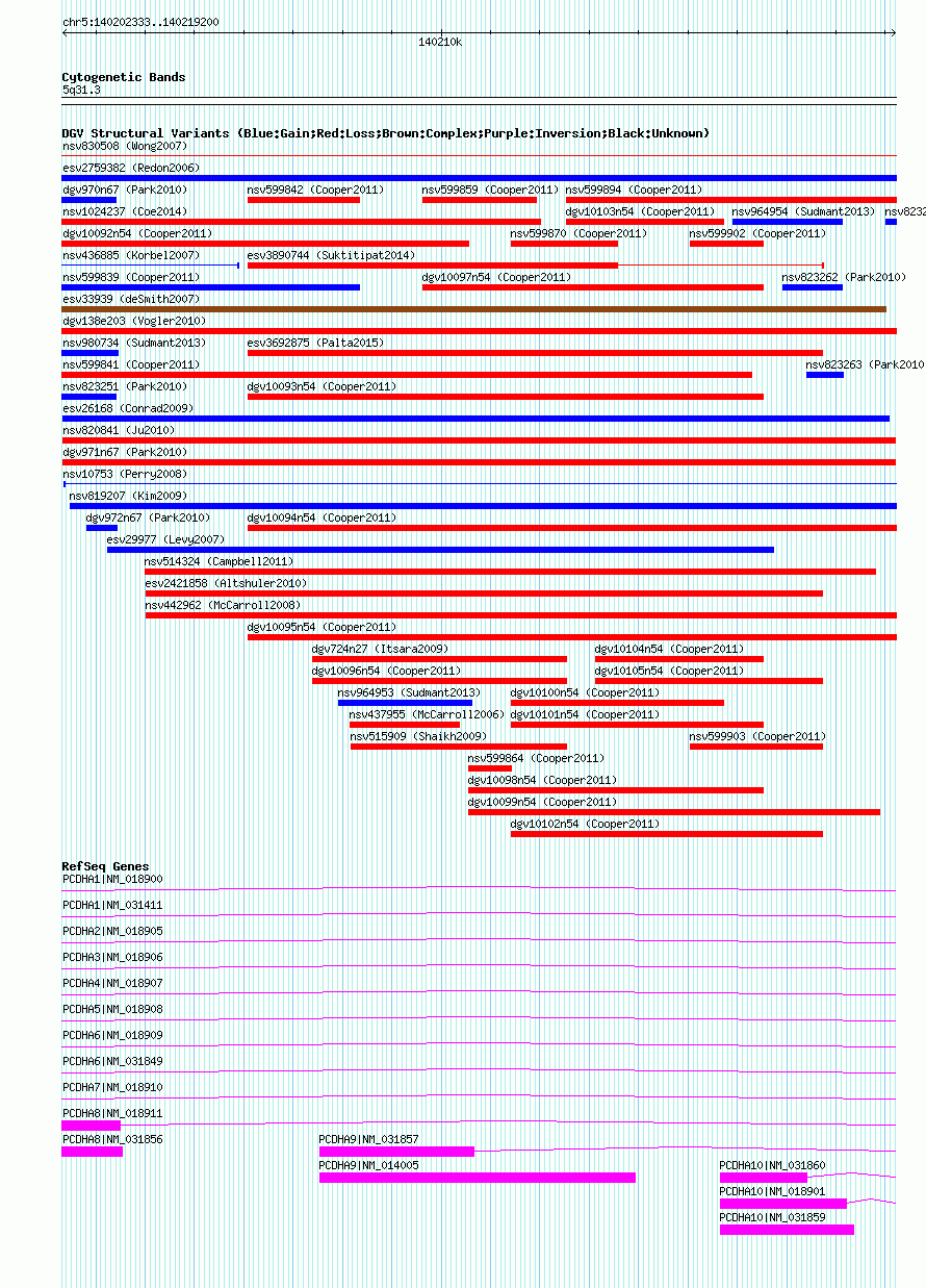 | | Variant Type | CNV loss | | Copy Number | | | Allele State | | | Allele Origin | | | Probe Count | | | Validation Flag | | | Merged Status | M | | Merged Variants | | | Supporting Variants | nsv823261, nsv823260, nsv823252, nsv823259 | | Samples | AK2, NA18947, AK16, NA18592, AK20, NA18999, NA18526, NA18969, AK10, AK6, NA18547, NA18942, NA18582, NA18949, AK14, AK8, NA18973, NA18951, NA18537, NA18566, NA18570, NA18542, NA18564, AK18, AK12, AK4, NA18972, NA18552, NA18968, NA18997 | | Known Genes | PCDHA1, PCDHA10, PCDHA2, PCDHA3, PCDHA4, PCDHA5, PCDHA6, PCDHA7, PCDHA8, PCDHA9 | | Method | Oligo aCGH | | Analysis | To select parameters for calling CNVs (that is, the statistical threshold of the ADM2 algorithm, the minimum +/- log2 ratio and the minimum number of consecutive probes in a CNV interval), we calculated the sensitivity and positive predictive value based on the comparison of aCGH-based CNV calls (using our high-resolution Agilent 24M platform) with read-depth sequence data for two samples from Korean individuals (AK1 and AK2). We attempted to obtain `absolute' copy number status of the sample from NA10851, which was used as the reference sample for aCGH experiments in this study. For this, we used read-depth data for NA10851 obtained from massively parallel sequencing by the Illumina GA II data. The read-depth data represent the copy number status of NA10851 as compared to the human reference genome (hg18) because the short read sequences were aligned to hg18. | | Platform | Agilent 24M aCGH | | Comments | | | Reference | Park_et_al_2010 | | Pubmed ID | 20364138 | | Accession Number(s) | dgv971n67
