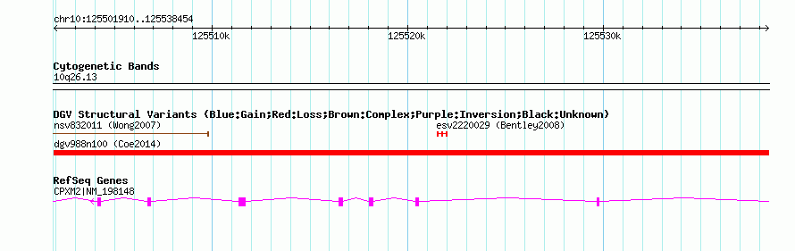 Variant DetailsVariant: dgv988n100| Internal ID | 22787075 | | Landmark | | | Location Information | | | Cytoband | 10q26.13 | | Allele length | | Assembly | Allele length | | hg38 | 36545 | | hg19 | 36545 | | hg18 | 36545 |