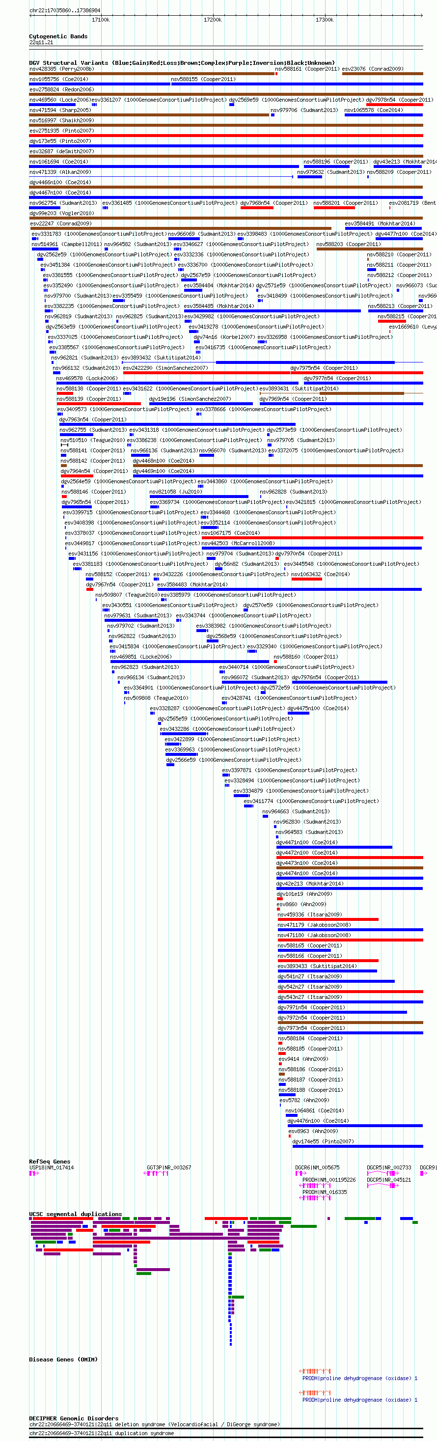| Variant Type | CNV gain+loss | Copy Number | | Allele State | | Allele Origin | | Probe Count | | Validation Flag | | Merged Status | M | Merged Variants | | Supporting Variants | esv2763706, esv2760714 | Samples | SW_1242, SW_1366, SW_1056, RW_0604, SW_1425, SW_1246, RW_0243, RW_0555, SW_1258, SW_1285, SW_0507, SW_0048, SW_0860, SW_0077, SW_0701, SW_0165, RW_0289, SW_0887, SW_0829, SW_1346, RW_0669, SW_1345, SW_0323, RW_0186, SW_0088, SW_1373, SW_1551, SW_1416, SW_0820, SW_1384, SW_1201, SW_0603, SW_1128, SW_0627, SW_1046 | Known Genes | DGCR5, DGCR6, DGCR9, GGT3P, PRODH, USP18 | Method | Merging | Analysis | Two different algorithms (PennCNV and Birdseye) were applied to detect CNVs. Only congruent CNV events regarding direction of effect that were detected by both algorithms were merged using the outer borders of the event in a first step. In a second step only CNVs that were detected in at least two individuals were merged into a CNVR. | Platform | Merging | Comments | | Reference | Vogler_et_al_2010 | Pubmed ID | 21179565 | Accession Number(s) | dgv99e203