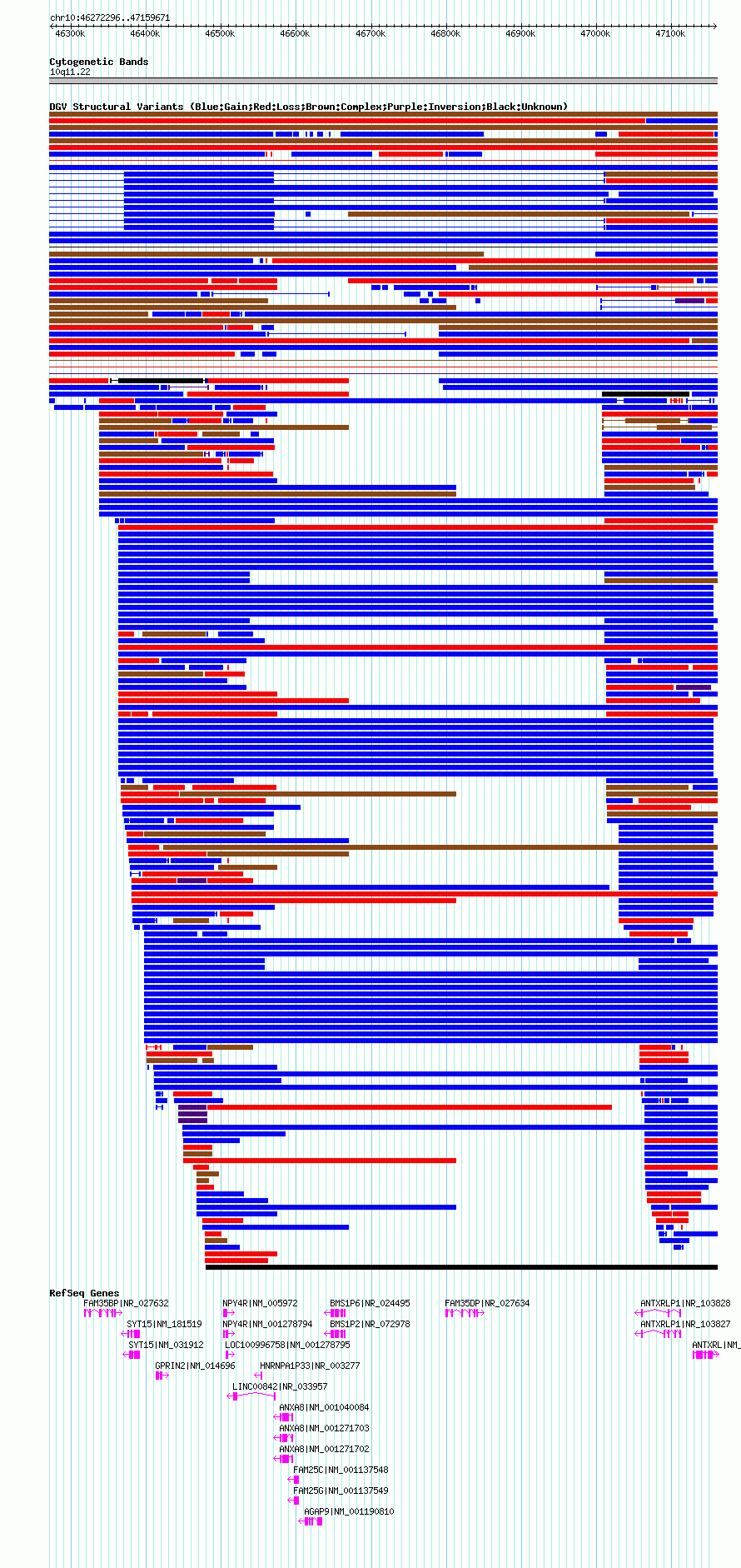 | | Variant Type | CNV loss | | Copy Number | | | Allele State | | | Allele Origin | | | Probe Count | | | Validation Flag | | | Merged Status | S | | Merged Variants | esv2758217 | | Supporting Variants | | | Samples | NA11994 | | Known Genes | AGAP9, ANTXRL, ANTXRLP1, ANXA8, BMS1P2, BMS1P6, FAM25C, FAM25G, FAM35BP, FAM35DP, GPRIN2, HNRNPA1P33, LINC00842, LOC100996758, NPY4R, SYT15 | | Method | BAC aCGH | | Analysis | Array images were acquired using an Agilent laser scanner (Agilent Technologies, UK). Fluorescence intensities and log2 ratio values were extracted using Bluefuse software (Bluegnome Ltd). | | Platform | Agilent | | Comments | | | Reference | Redon_et_al_2006 | | Pubmed ID | 17122850 | | Accession Number(s) | essv18330
