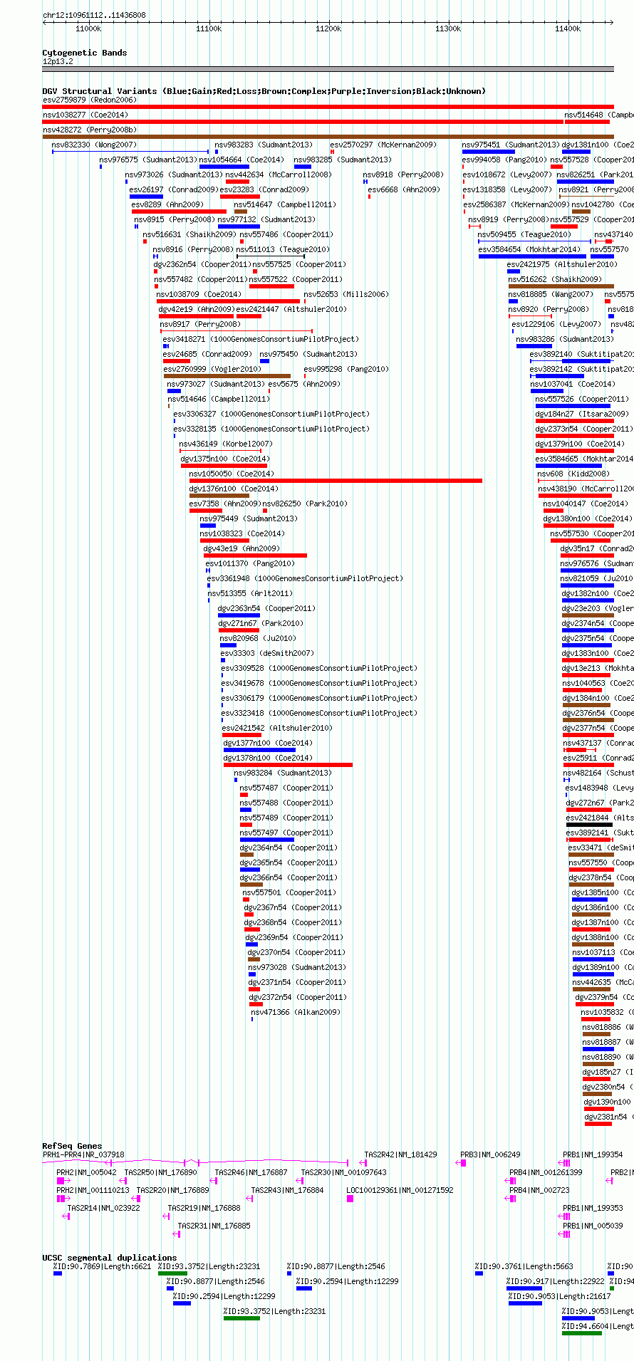 | | Variant Type | CNV loss | | Copy Number | | | Allele State | | | Allele Origin | | | Probe Count | | | Validation Flag | | | Merged Status | S | | Merged Variants | esv2758294 | | Supporting Variants | | | Samples | NA12005 | | Known Genes | LOC100129361, PRB1, PRB2, PRB3, PRB4, PRH1-PRR4, PRH2, TAS2R14, TAS2R19, TAS2R20, TAS2R30, TAS2R31, TAS2R42, TAS2R43, TAS2R46, TAS2R50 | | Method | BAC aCGH | | Analysis | Array images were acquired using an Agilent laser scanner (Agilent Technologies, UK). Fluorescence intensities and log2 ratio values were extracted using Bluefuse software (Bluegnome Ltd). | | Platform | Agilent | | Comments | | | Reference | Redon_et_al_2006 | | Pubmed ID | 17122850 | | Accession Number(s) | essv19008