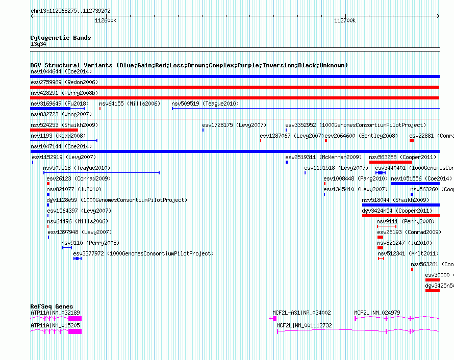 | | Variant Type | CNV loss | | Copy Number | | | Allele State | | | Allele Origin | | | Probe Count | | | Validation Flag | | | Merged Status | S | | Merged Variants | esv2758346 | | Supporting Variants | | | Samples | NA18959 | | Known Genes | ATP11A, MCF2L, MCF2L-AS1 | | Method | BAC aCGH | | Analysis | Array images were acquired using an Agilent laser scanner (Agilent Technologies, UK). Fluorescence intensities and log2 ratio values were extracted using Bluefuse software (Bluegnome Ltd). | | Platform | Agilent | | Comments | | | Reference | Redon_et_al_2006 | | Pubmed ID | 17122850 | | Accession Number(s) | essv1950