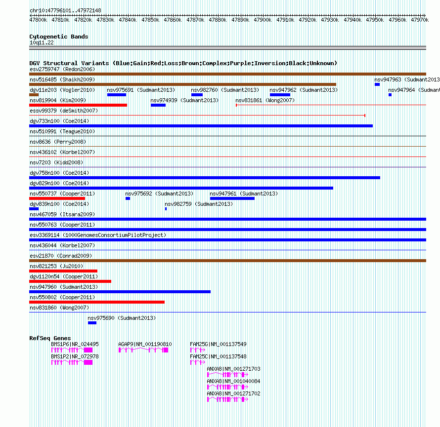 Variant DetailsVariant: essv19906| Internal ID | 9960479 | | Landmark | | | Location Information | | | Cytoband | 10q11.22 | | Allele length | | Assembly | Allele length | | hg19 | 176048 | | hg18 | 176048 | | hg17 | 176048 |