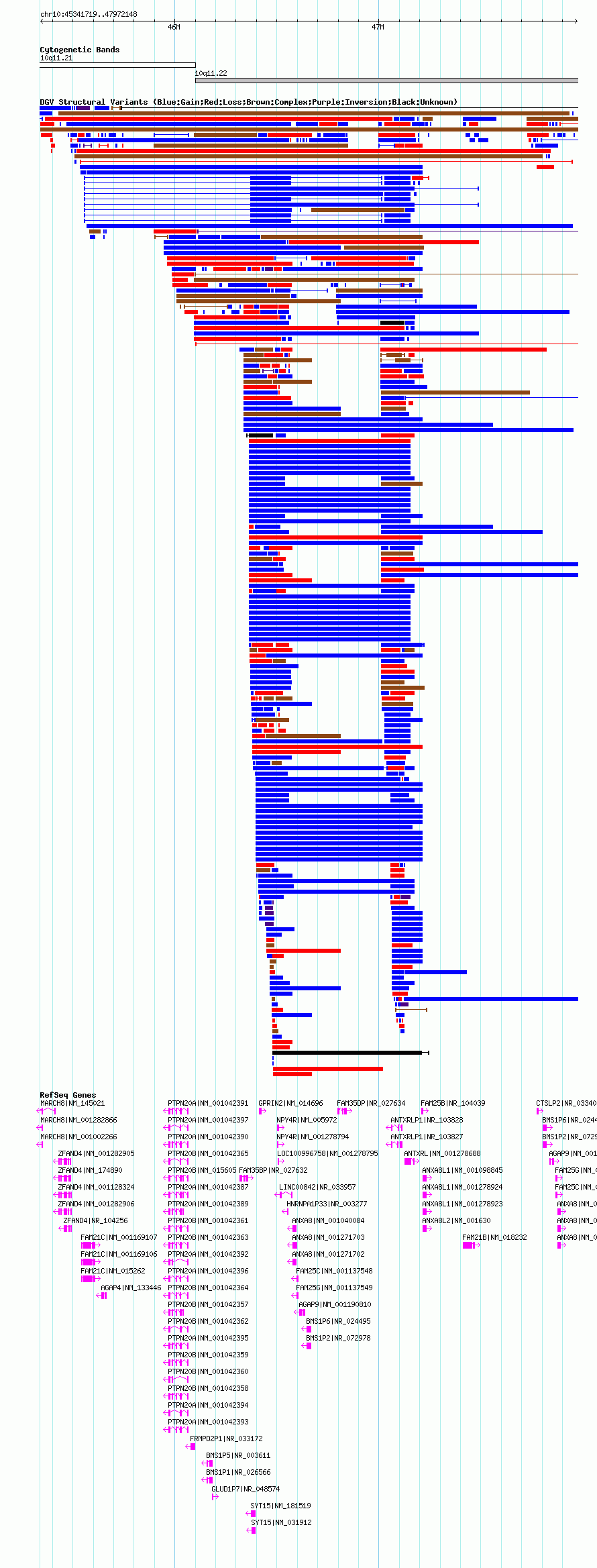 Variant DetailsVariant: essv21258| Internal ID | 9955850 | | Landmark | | | Location Information | | | Cytoband | 10q11.21 | | Allele length | | Assembly | Allele length | | hg19 | 2330430 | | hg18 | 2630430 | | hg17 | 2630430 |
