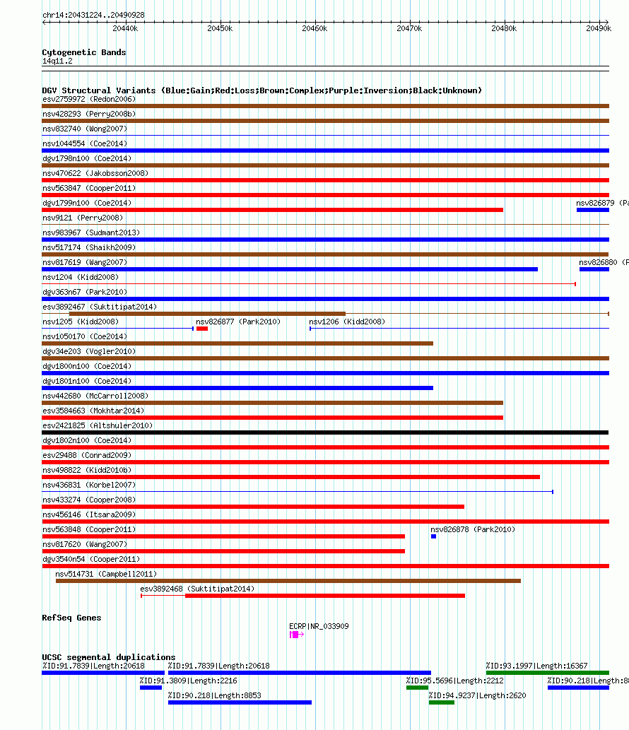 Variant DetailsVariant: essv25778851Internal ID | 18814294 | Landmark | | Location Information | | Cytoband | 14q11.2 | Allele length | Assembly | Allele length | hg38 | 59705 | hg19 | 59705 | hg18 | 59705 |
