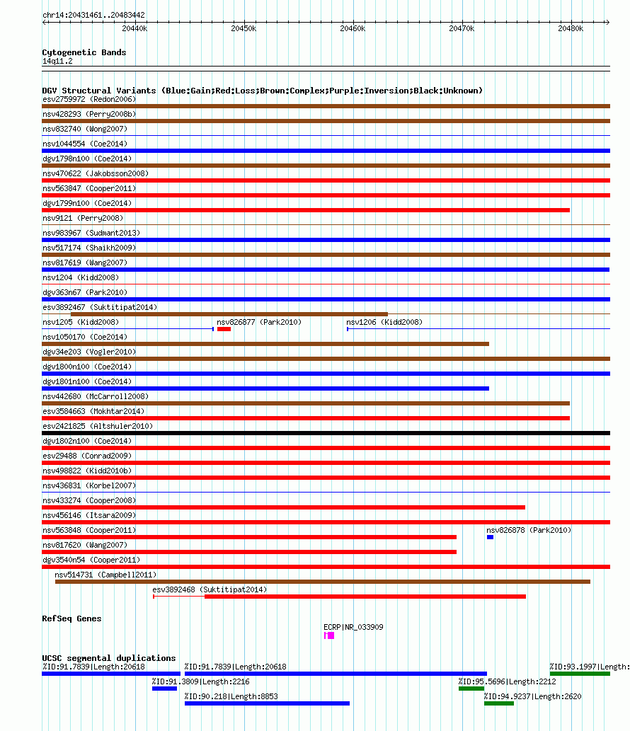 Variant DetailsVariant: essv25779098Internal ID | 18827768 | Landmark | | Location Information | | Cytoband | 14q11.2 | Allele length | Assembly | Allele length | hg38 | 51982 | hg19 | 51982 | hg18 | 51982 |