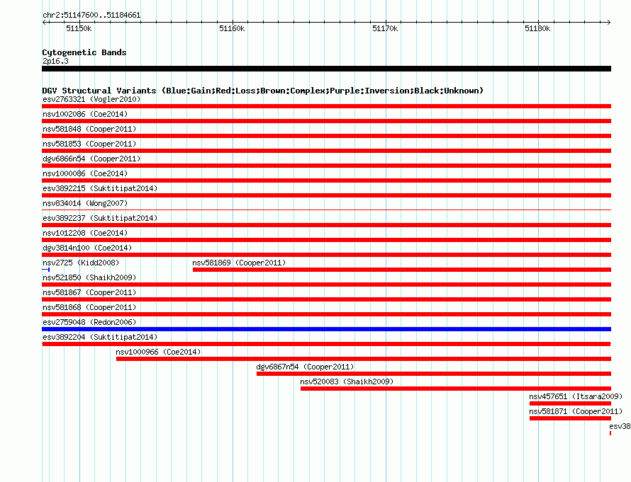 Variant DetailsVariant: essv25779477| Internal ID | 19178560 | | Landmark | | | Location Information | | | Cytoband | 2p16.3 | | Allele length | | Assembly | Allele length | | hg38 | 37062 | | hg19 | 37062 | | hg18 | 37062 |