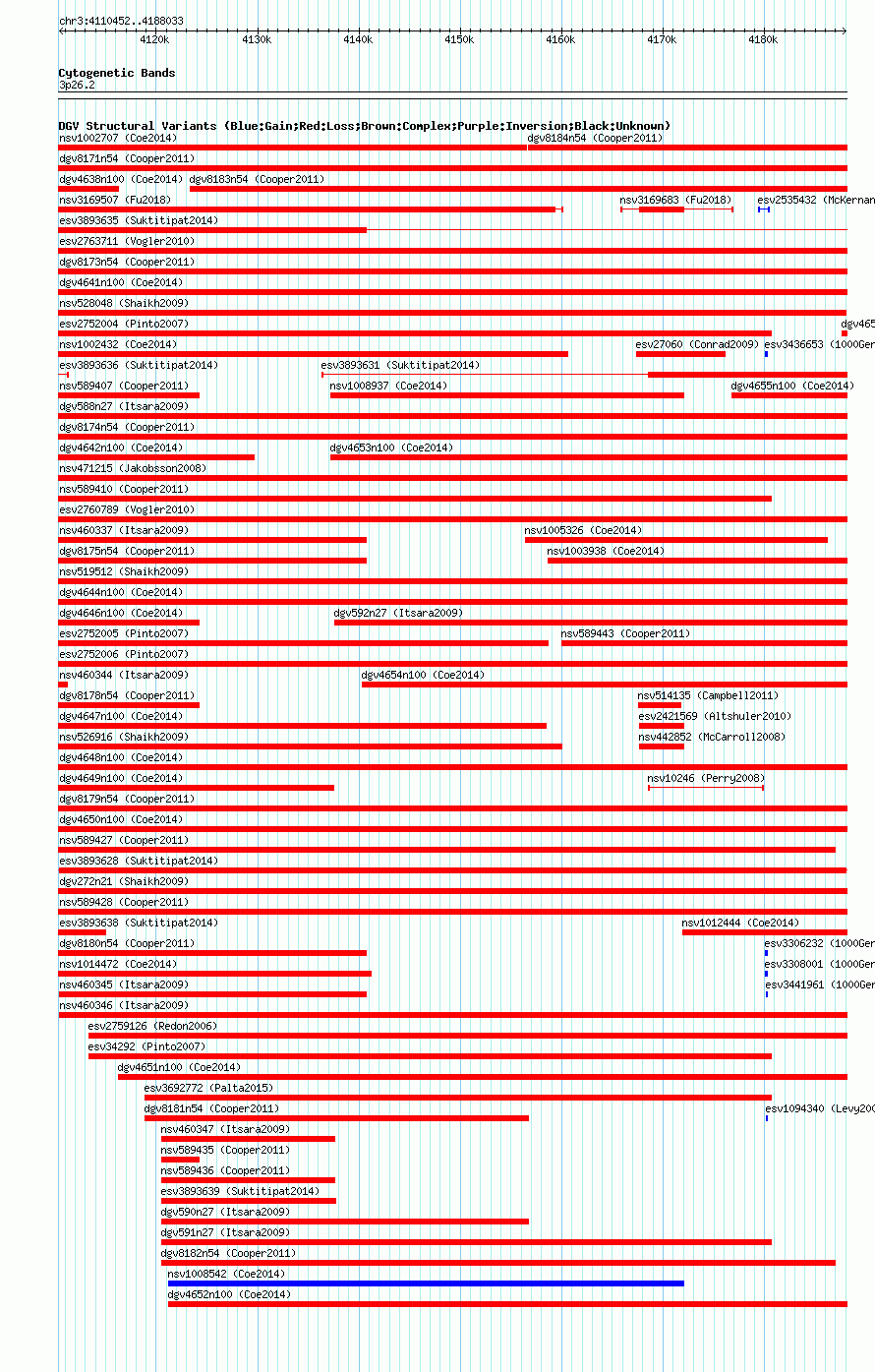 Variant DetailsVariant: essv25780795| Internal ID | 19161534 | | Landmark | | | Location Information | | | Cytoband | 3p26.1 | | Allele length | | Assembly | Allele length | | hg38 | 77582 | | hg19 | 77582 | | hg18 | 77582 |