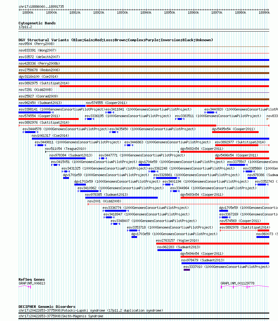 Variant DetailsVariant: essv25781245| Internal ID | 19162318 | | Landmark | | | Location Information | | | Cytoband | 17p11.2 | | Allele length | | Assembly | Allele length | | hg38 | 105676 | | hg19 | 105676 | | hg18 | 105676 |