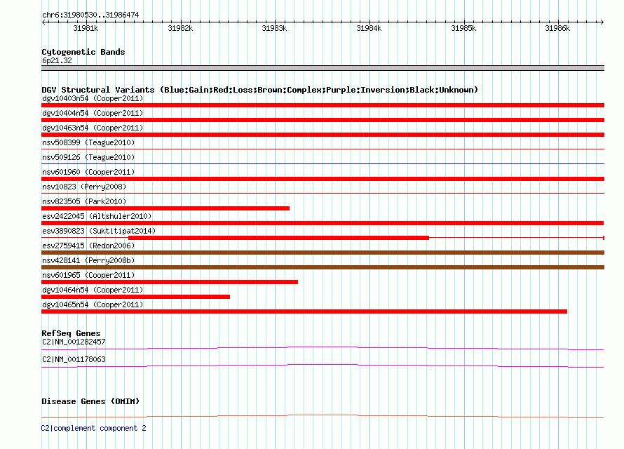 Variant DetailsVariant: essv25781884| Internal ID | 18817938 | | Landmark | | | Location Information | | | Cytoband | 6p21.32 | | Allele length | | Assembly | Allele length | | hg38 | 5945 | | hg19 | 5945 | | hg18 | 5945 |
