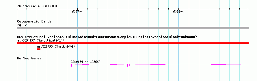 Variant DetailsVariant: essv25783796| Internal ID | 19167447 | | Landmark | | | Location Information | | | Cytoband | 5q12.1 | | Allele length | | Assembly | Allele length | | hg38 | 22796 | | hg19 | 22796 | | hg18 | 22796 |