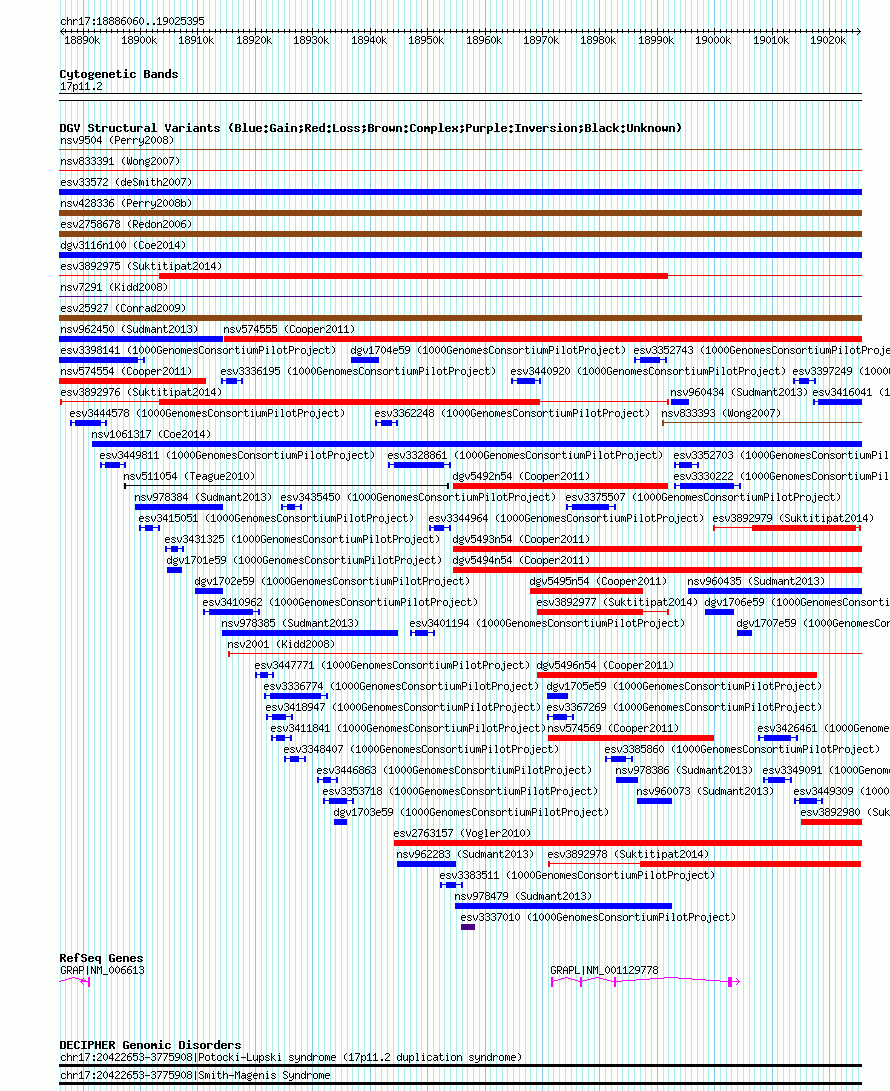 Variant DetailsVariant: essv25783901| Internal ID | 19170785 | | Landmark | | | Location Information | | | Cytoband | 17p11.2 | | Allele length | | Assembly | Allele length | | hg38 | 139468 | | hg19 | 139468 | | hg18 | 139336 |