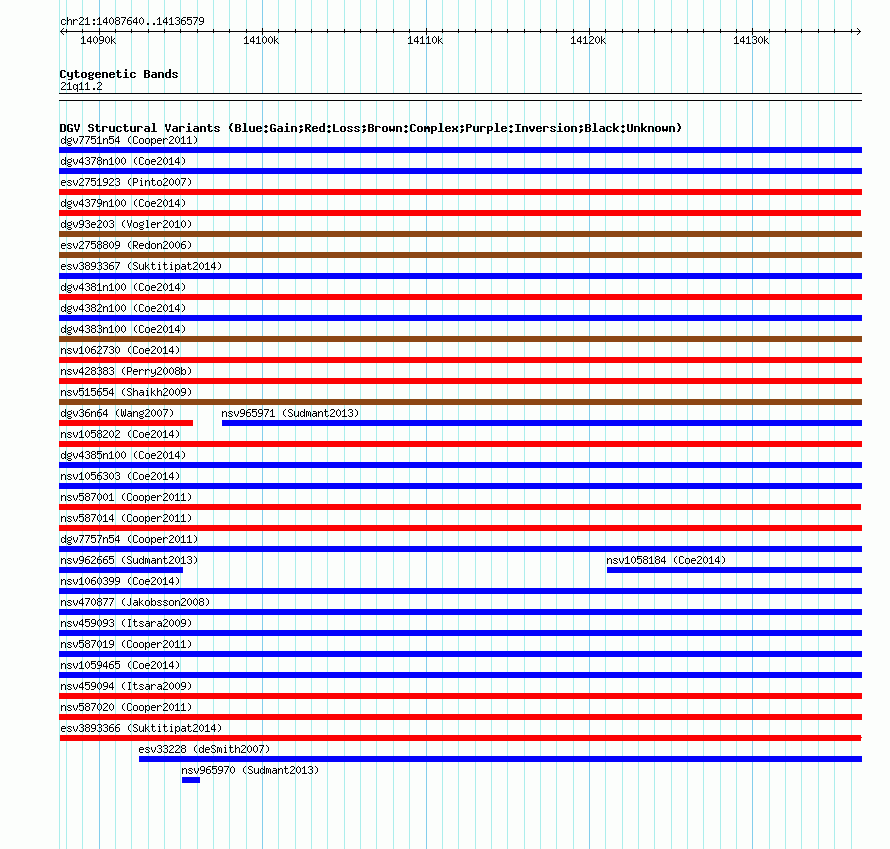 Variant DetailsVariant: essv25784596| Internal ID | 19174108 | | Landmark | | | Location Information | | | Cytoband | 21q11.2 | | Allele length | | Assembly | Allele length | | hg38 | 48940 | | hg19 | 48940 | | hg18 | 48940 |