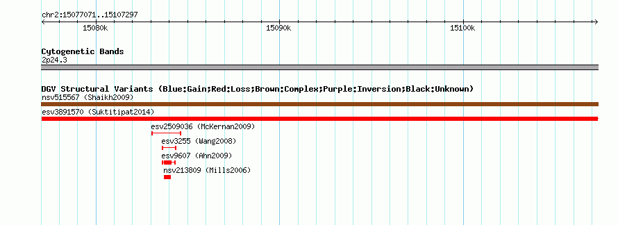 Variant DetailsVariant: essv25785164| Internal ID | 19174501 | | Landmark | | | Location Information | | | Cytoband | 2p24.3 | | Allele length | | Assembly | Allele length | | hg38 | 30227 | | hg19 | 30227 | | hg18 | 30227 |