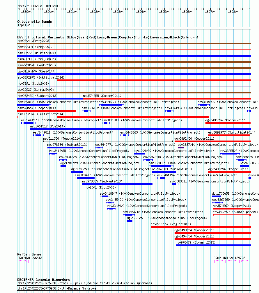 Variant DetailsVariant: essv25785381| Internal ID | 19177142 | | Landmark | | | Location Information | | | Cytoband | 17p11.2 | | Allele length | | Assembly | Allele length | | hg38 | 101329 | | hg19 | 101329 | | hg18 | 101329 |