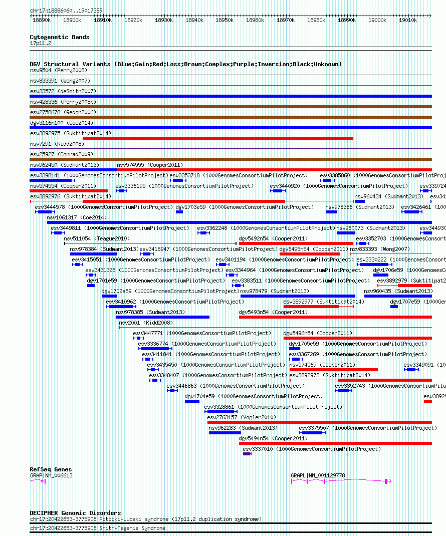 Variant DetailsVariant: essv25785429| Internal ID | 19162924 | | Landmark | | | Location Information | | | Cytoband | 17p11.2 | | Allele length | | Assembly | Allele length | | hg38 | 131330 | | hg19 | 131330 | | hg18 | 131330 |