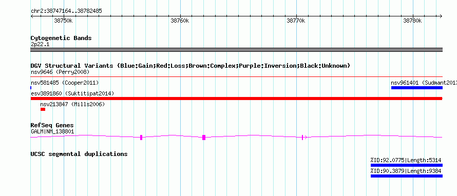 | Variant Type | CNV loss | Copy Number | 1 | Allele State | | Allele Origin | | Probe Count | | Validation Flag | | Merged Status | S | Merged Variants | esv3891860 | Supporting Variants | | Samples | | Known Genes | GALM | Method | SNP array | Analysis | | Platform | Illumina HumanHap 610 | Comments | Number of probes=10 | Reference | Suktitipat_et_al_2014 | Pubmed ID | 25118596 | Accession Number(s) | essv25785938
