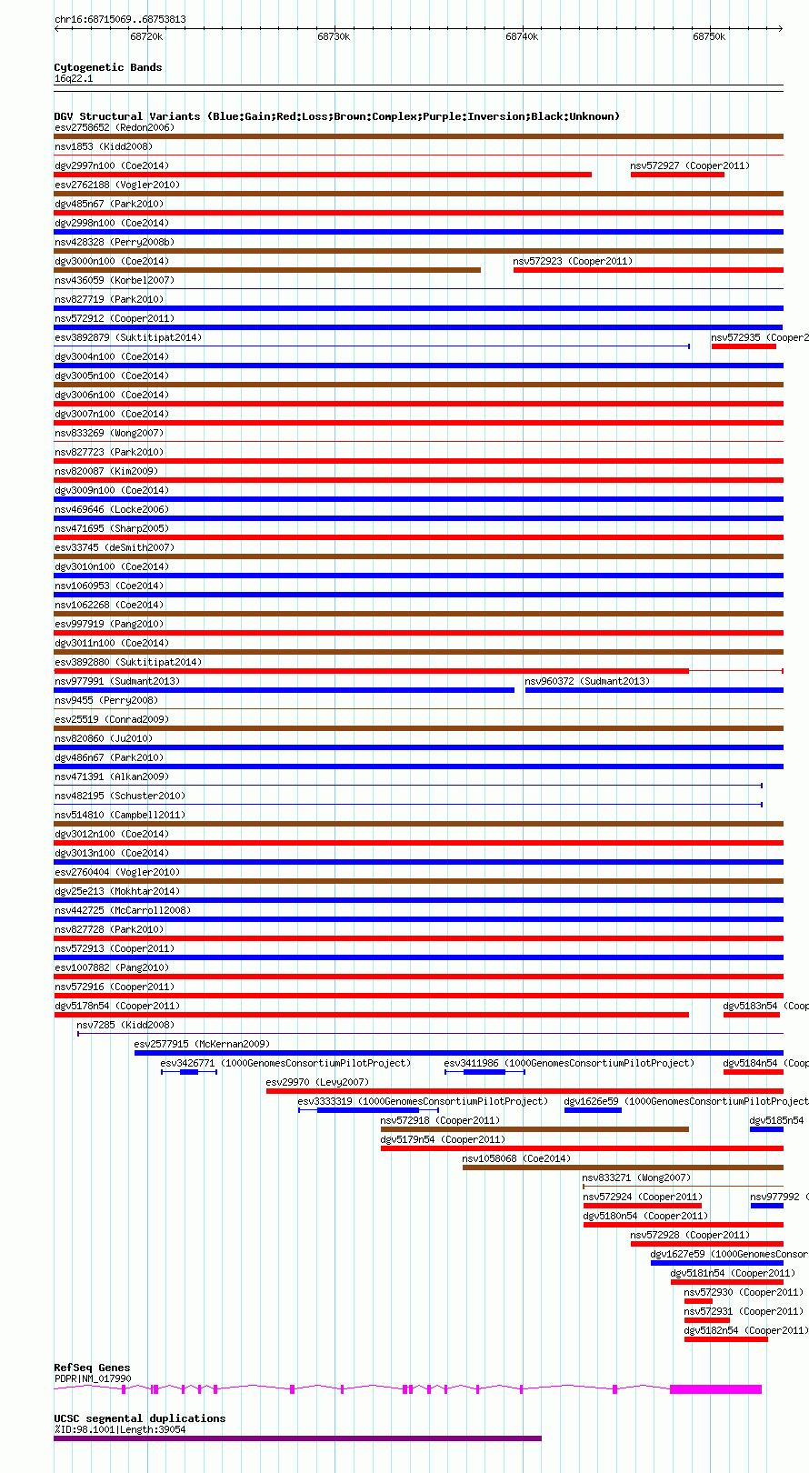 Variant DetailsVariant: essv25786204| Internal ID | 18817315 | | Landmark | | | Location Information | | | Cytoband | 16q22.1 | | Allele length | | Assembly | Allele length | | hg38 | 38745 | | hg19 | 38745 | | hg18 | 38745 |