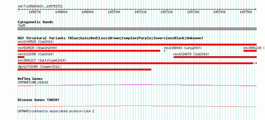 | | Variant Type | CNV loss | | Copy Number | 1 | | Allele State | | | Allele Origin | | | Probe Count | | | Validation Flag | | | Merged Status | S | | Merged Variants | esv3891227 | | Supporting Variants | | | Samples | | | Known Genes | CNTNAP2 | | Method | SNP array | | Analysis | | | Platform | Illumina HumanHap 610 | | Comments | Number of probes=28 | | Reference | Suktitipat_et_al_2014 | | Pubmed ID | 25118596 | | Accession Number(s) | essv25786457