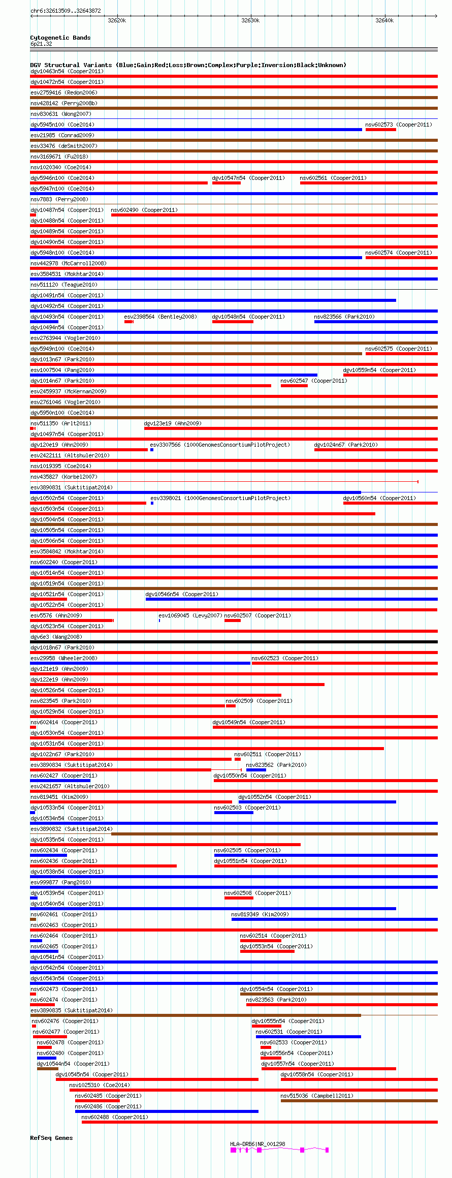 Variant DetailsVariant: essv25787583| Internal ID | 19168708 | | Landmark | | | Location Information | | | Cytoband | 6p21.32 | | Allele length | | Assembly | Allele length | | hg38 | 30364 | | hg19 | 30364 | | hg18 | 30364 |