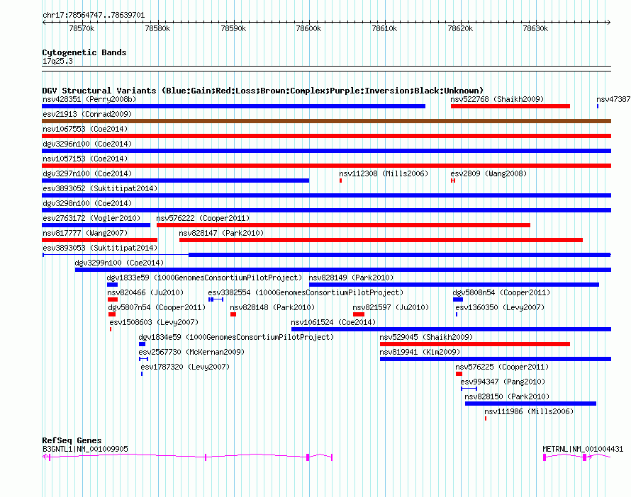 | | Variant Type | CNV gain | | Copy Number | 3 | | Allele State | | | Allele Origin | | | Probe Count | | | Validation Flag | | | Merged Status | S | | Merged Variants | esv3893053 | | Supporting Variants | | | Samples | | | Known Genes | B3GNTL1, METRNL | | Method | SNP array | | Analysis | | | Platform | Illumina Human OmniExpress | | Comments | Number of probes=21 | | Reference | Suktitipat_et_al_2014 | | Pubmed ID | 25118596 | | Accession Number(s) | essv25787821