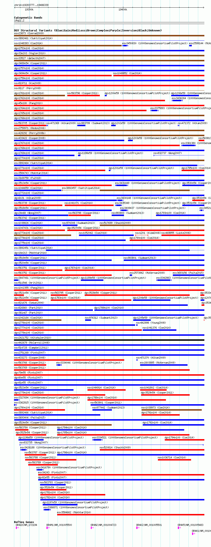 Variant DetailsVariant: essv25787871| Internal ID | 19171955 | | Landmark | | | Location Information | | | Cytoband | 14q11.2 | | Allele length | | Assembly | Allele length | | hg38 | 202563 | | hg19 | 202563 | | hg18 | 202563 |