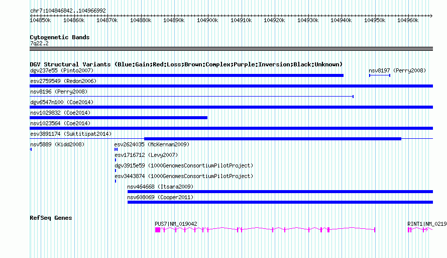 Variant DetailsVariant: essv25787983| Internal ID | 19170465 | | Landmark | | | Location Information | | | Cytoband | 7q22.2 | | Allele length | | Assembly | Allele length | | hg38 | 120151 | | hg19 | 120151 | | hg18 | 120151 |