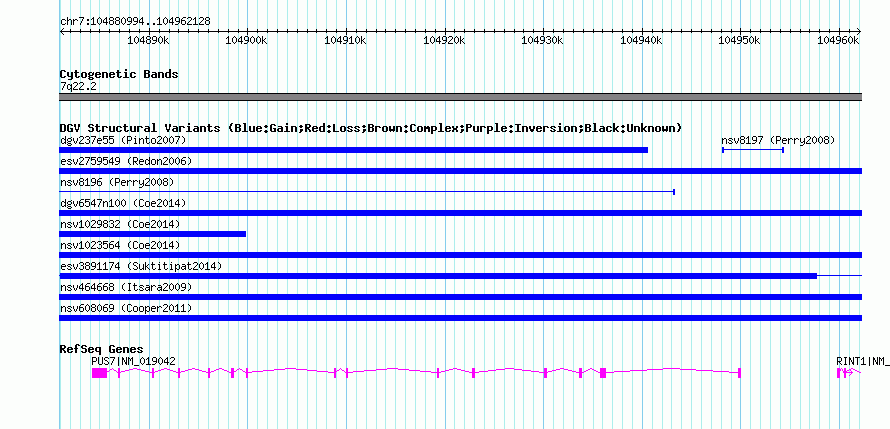 Variant DetailsVariant: essv25788000| Internal ID | 19164129 | | Landmark | | | Location Information | | | Cytoband | 7q22.2 | | Allele length | | Assembly | Allele length | | hg38 | 81135 | | hg19 | 81135 | | hg18 | 81135 |