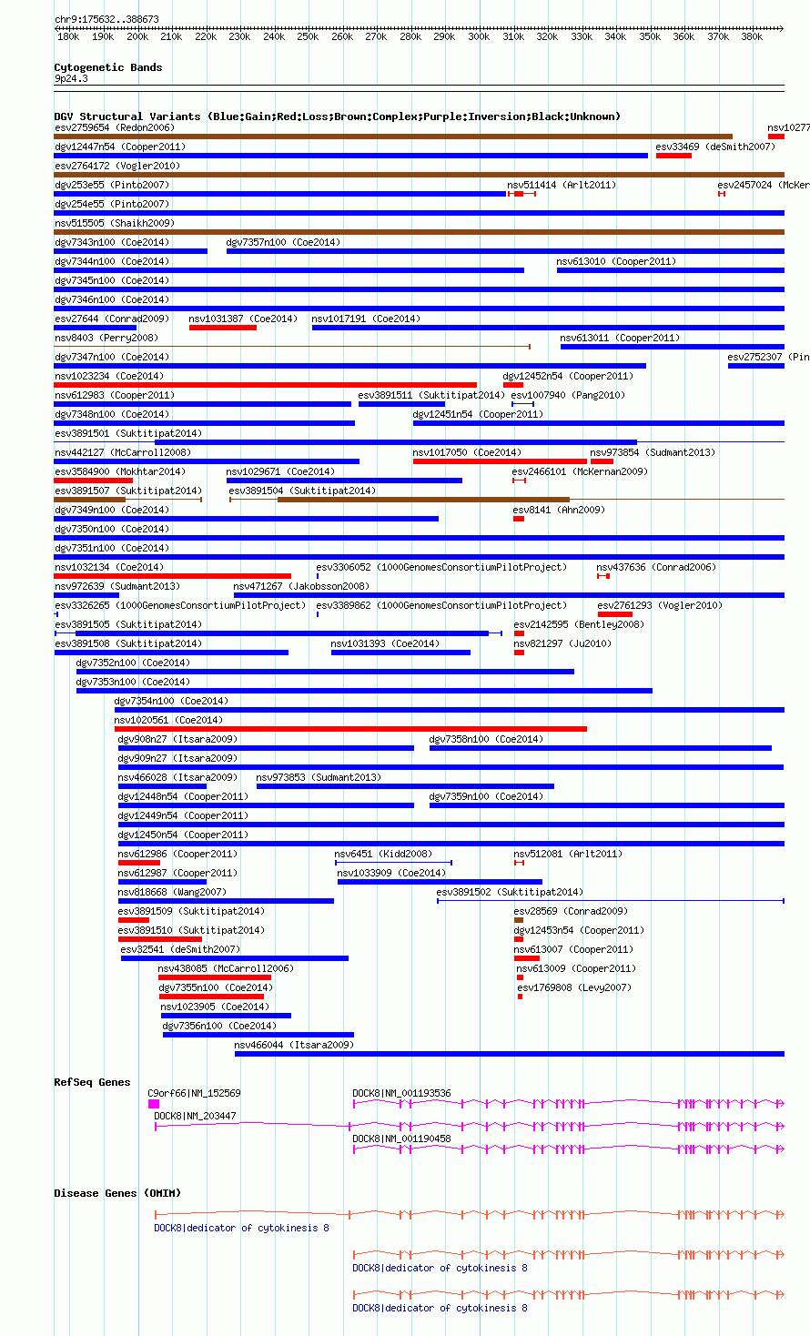 | | Variant Type | CNV gain | | Copy Number | 3 | | Allele State | | | Allele Origin | | | Probe Count | | | Validation Flag | | | Merged Status | S | | Merged Variants | esv3891501 | | Supporting Variants | | | Samples | | | Known Genes | C9orf66, DOCK8 | | Method | SNP array | | Analysis | | | Platform | Illumina Human OmniExpress | | Comments | Number of probes=105 | | Reference | Suktitipat_et_al_2014 | | Pubmed ID | 25118596 | | Accession Number(s) | essv25788091