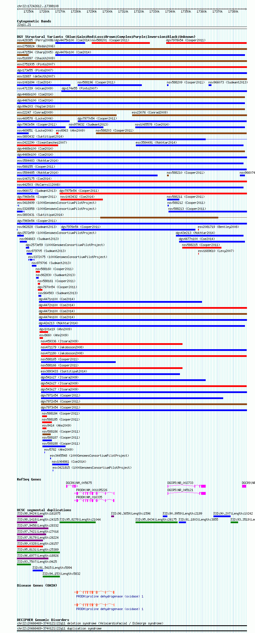 | Variant Type | CNV gain | Copy Number | 3 | Allele State | | Allele Origin | | Probe Count | | Validation Flag | | Merged Status | S | Merged Variants | esv3893431 | Supporting Variants | | Samples | | Known Genes | DGCR5, DGCR6, DGCR9, PRODH | Method | SNP array | Analysis | | Platform | Illumina HumanHap 610 | Comments | Number of probes=42 | Reference | Suktitipat_et_al_2014 | Pubmed ID | 25118596 | Accession Number(s) | essv25788508
