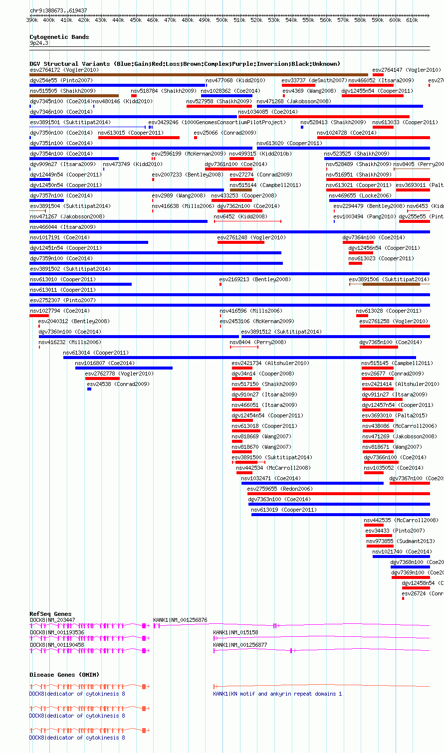 Variant DetailsVariant: essv25788519| Internal ID | 19162987 | | Landmark | | | Location Information | | | Cytoband | 9p24.3 | | Allele length | | Assembly | Allele length | | hg38 | 230765 | | hg19 | 230765 | | hg18 | 230765 |