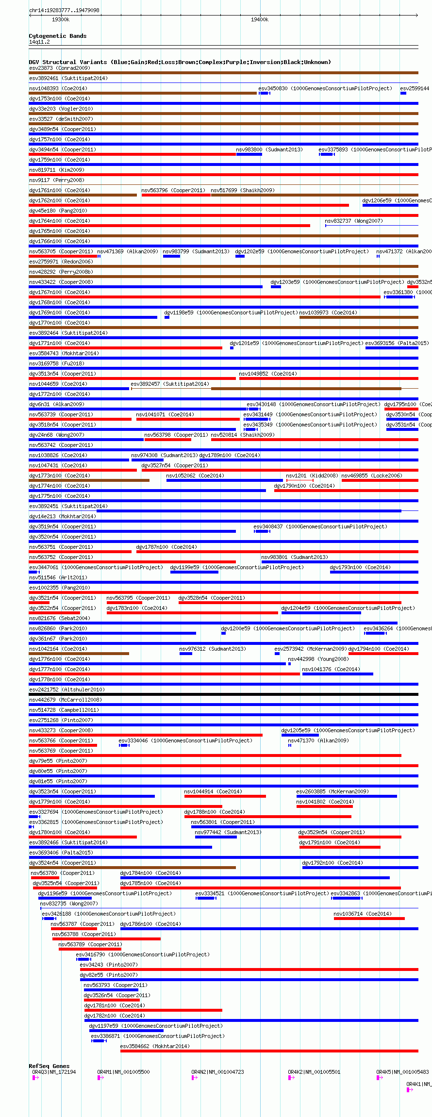 Variant DetailsVariant: essv25788633| Internal ID | 19173777 | | Landmark | | | Location Information | | | Cytoband | 14q11.2 | | Allele length | | Assembly | Allele length | | hg38 | 195322 | | hg19 | 195322 | | hg18 | 195322 |