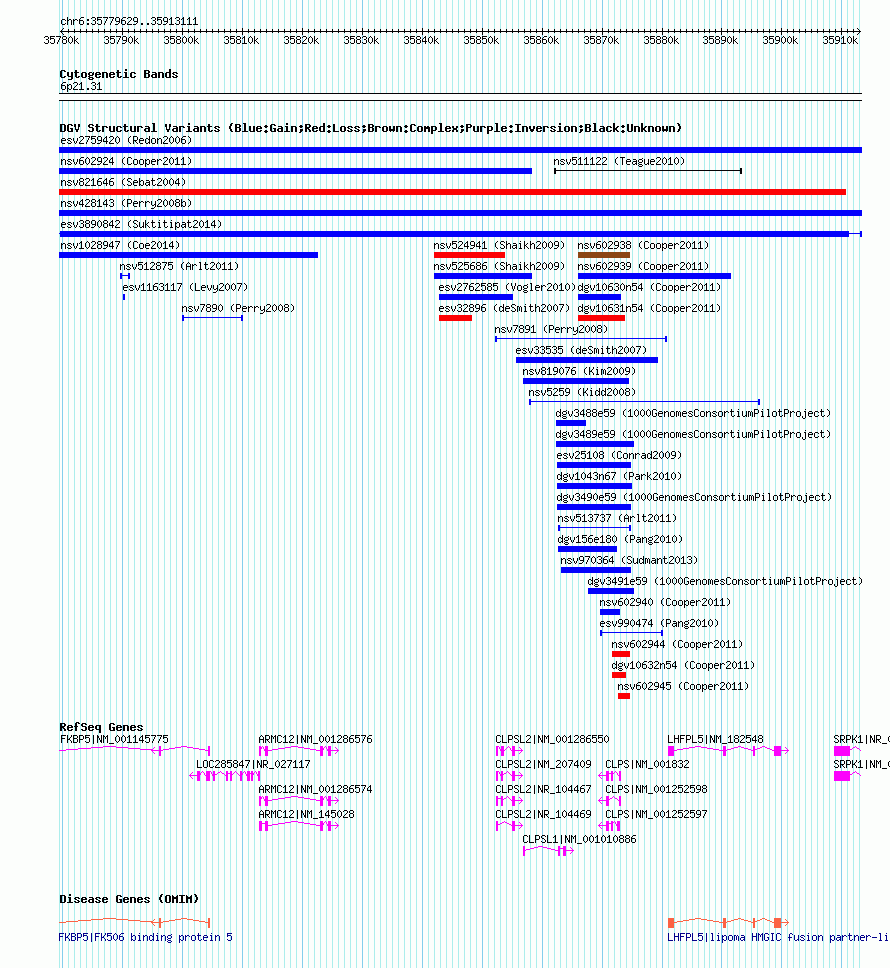 Variant DetailsVariant: essv25788882| Internal ID | 18827715 | | Landmark | | | Location Information | | | Cytoband | 6p21.31 | | Allele length | | Assembly | Allele length | | hg38 | 133483 | | hg19 | 133483 | | hg18 | 133483 |
