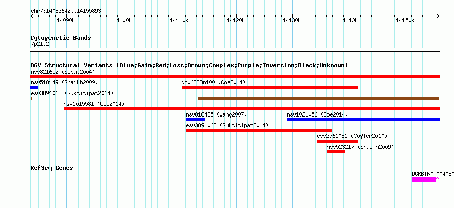 |  | Variant Type | CNV gain |  | Copy Number | 3 |  | Allele State |  |  | Allele Origin |  |  | Probe Count |  |  | Validation Flag |  |  | Merged Status | S |  | Merged Variants | esv3891062 |  | Supporting Variants |  |  | Samples |  |  | Known Genes | DGKB |  | Method | SNP array |  | Analysis |  |  | Platform | Illumina HumanHap 610 |  | Comments | Number of probes=26 |  | Reference | Suktitipat_et_al_2014 |  | Pubmed ID | 25118596 |  | Accession Number(s) | essv25788940
