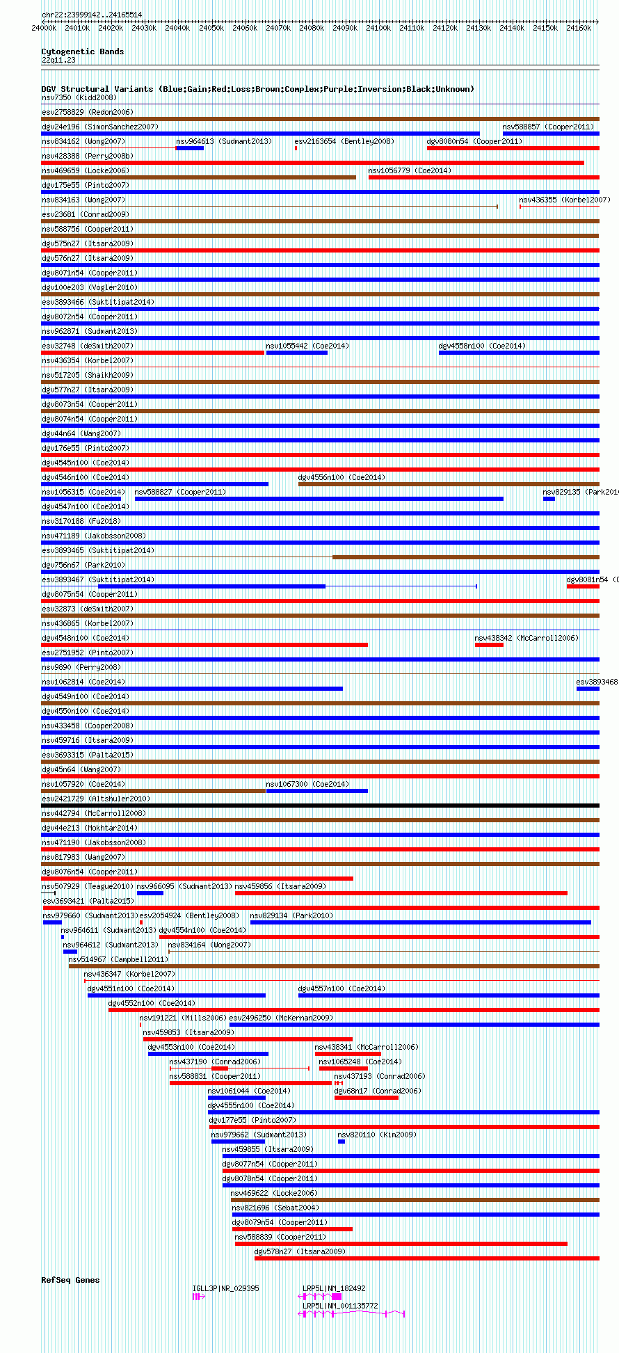 Variant DetailsVariant: essv25789395| Internal ID | 19164101 | | Landmark | | | Location Information | | | Cytoband | 22q11.23 | | Allele length | | Assembly | Allele length | | hg38 | 166373 | | hg19 | 166373 | | hg18 | 166373 |