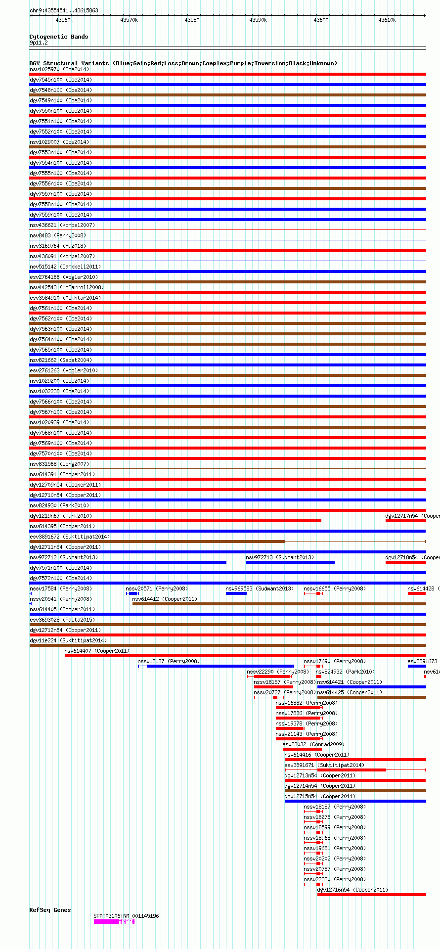Variant DetailsVariant: essv25789479| Internal ID | 19179200 | | Landmark | | | Location Information | | | Cytoband | 9p11.2 | | Allele length | | Assembly | Allele length | | hg19 | 61323 | | hg18 | 61323 |