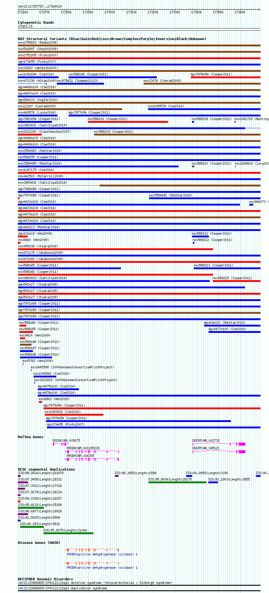 | Variant Type | CNV gain | Copy Number | 3 | Allele State | | Allele Origin | | Probe Count | | Validation Flag | | Merged Status | S | Merged Variants | esv3893431 | Supporting Variants | | Samples | | Known Genes | DGCR5, DGCR6, PRODH | Method | SNP array | Analysis | | Platform | Illumina HumanHap 610 | Comments | Number of probes=32 | Reference | Suktitipat_et_al_2014 | Pubmed ID | 25118596 | Accession Number(s) | essv25789493