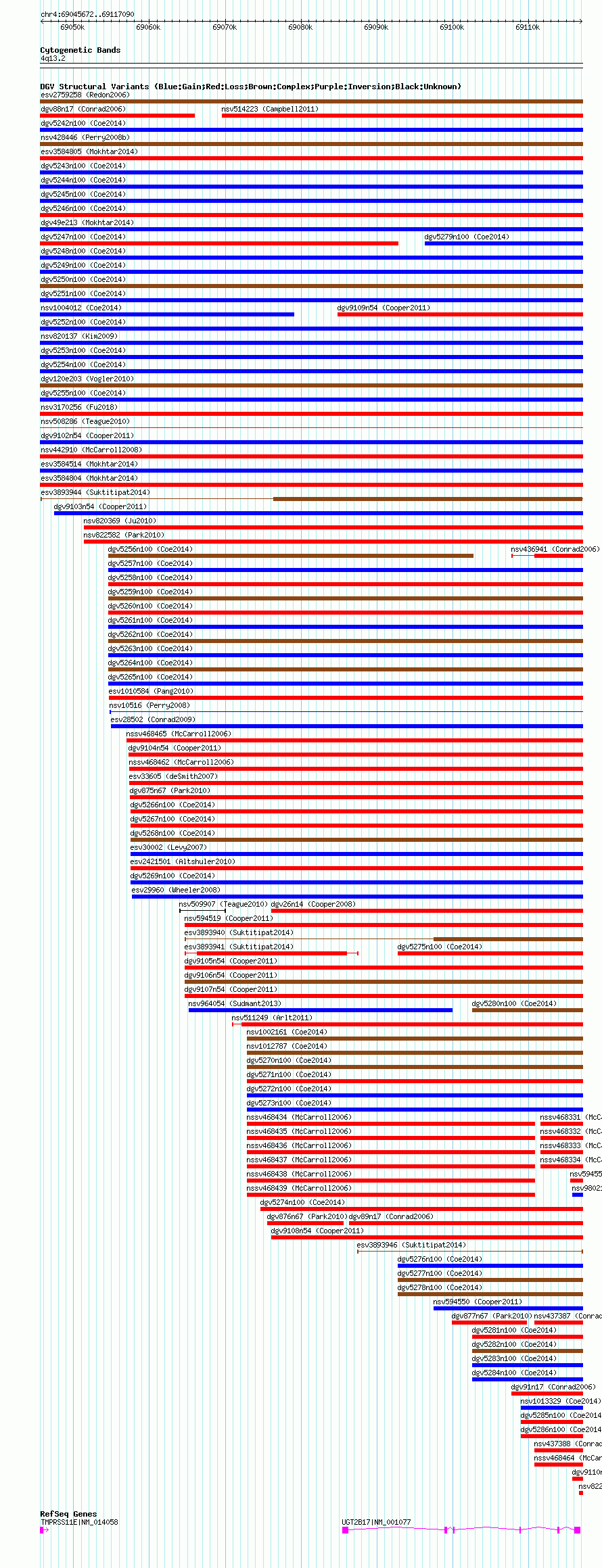 Variant DetailsVariant: essv25789537| Internal ID | 19178038 | | Landmark | | | Location Information | | | Cytoband | 4q13.2 | | Allele length | | Assembly | Allele length | | hg38 | 71419 | | hg19 | 71419 | | hg18 | 71419 |