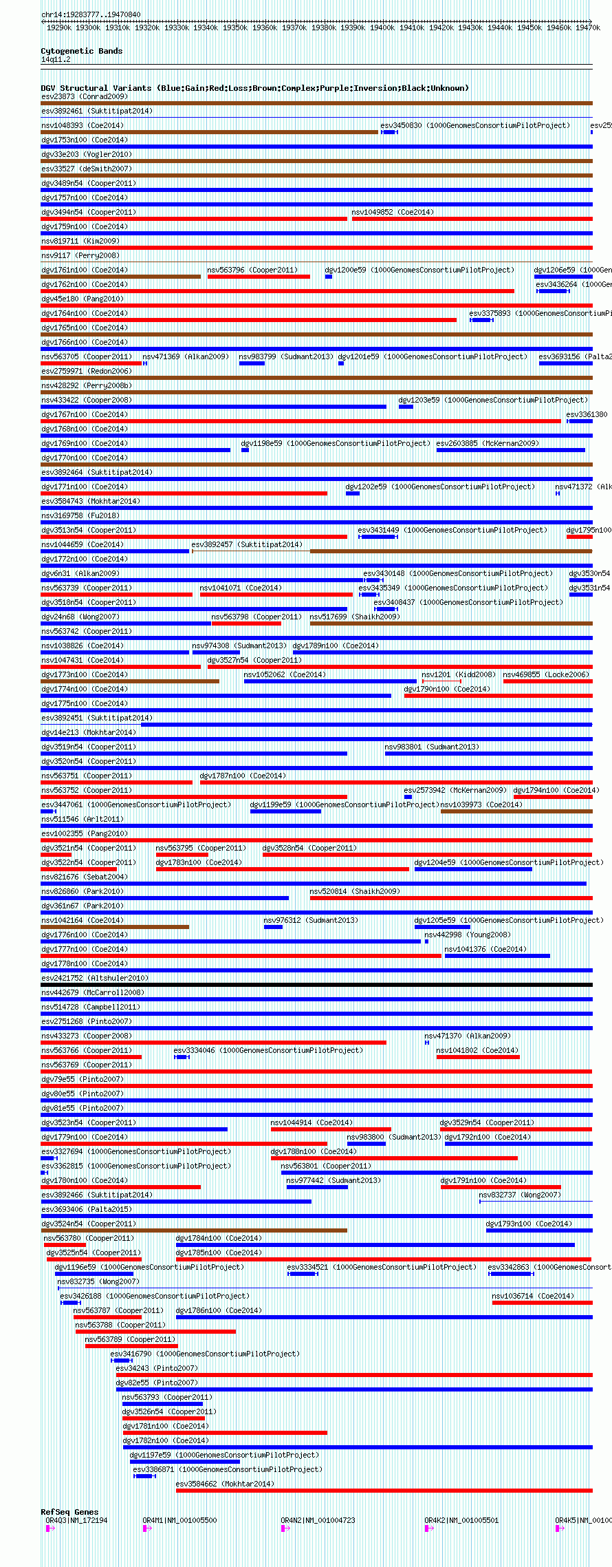 Variant DetailsVariant: essv25789579| Internal ID | 19163904 | | Landmark | | | Location Information | | | Cytoband | 14q11.2 | | Allele length | | Assembly | Allele length | | hg38 | 187064 | | hg19 | 187064 | | hg18 | 187064 |