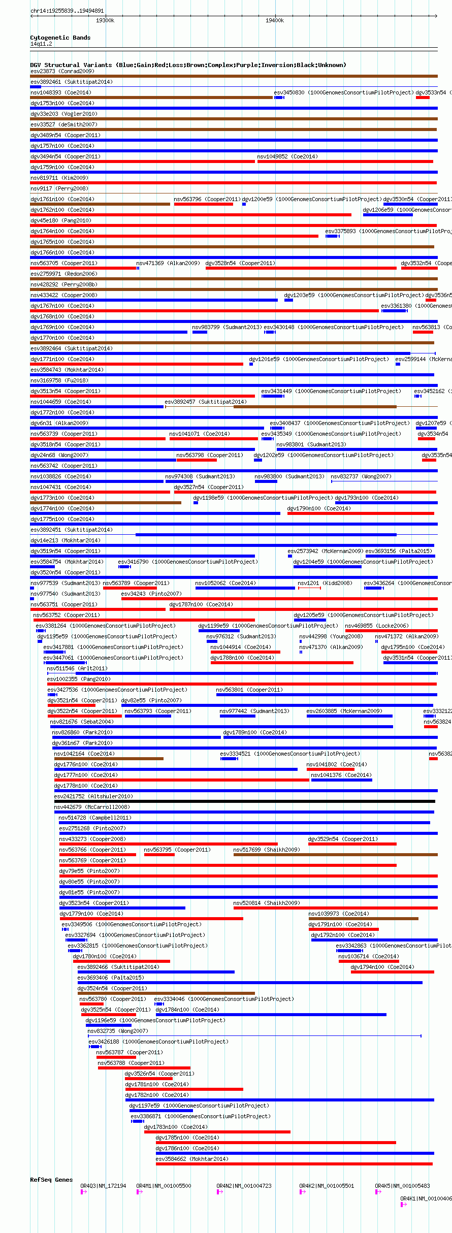 Variant DetailsVariant: essv25789732| Internal ID | 19180082 | | Landmark | | | Location Information | | | Cytoband | 14q11.2 | | Allele length | | Assembly | Allele length | | hg38 | 239053 | | hg19 | 239053 | | hg18 | 239053 |