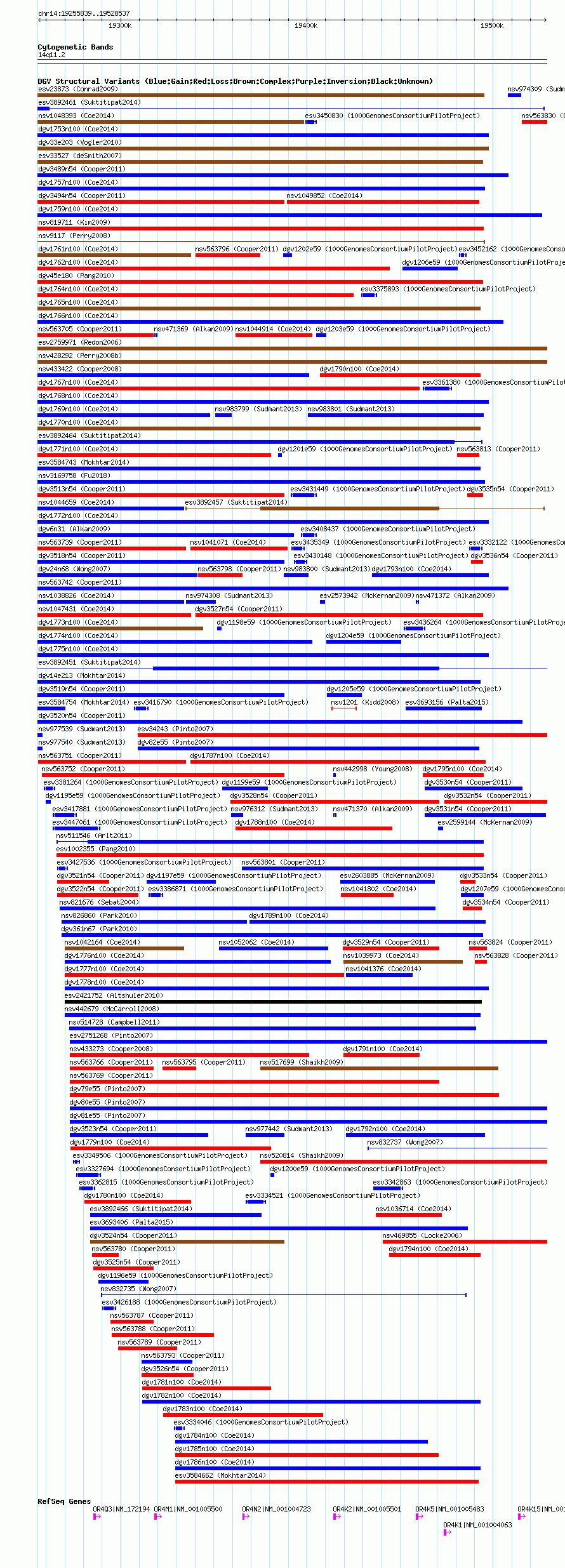 Variant DetailsVariant: essv25789920| Internal ID | 19162344 | | Landmark | | | Location Information | | | Cytoband | 14q11.2 | | Allele length | | Assembly | Allele length | | hg38 | 272699 | | hg19 | 272699 | | hg18 | 272699 |