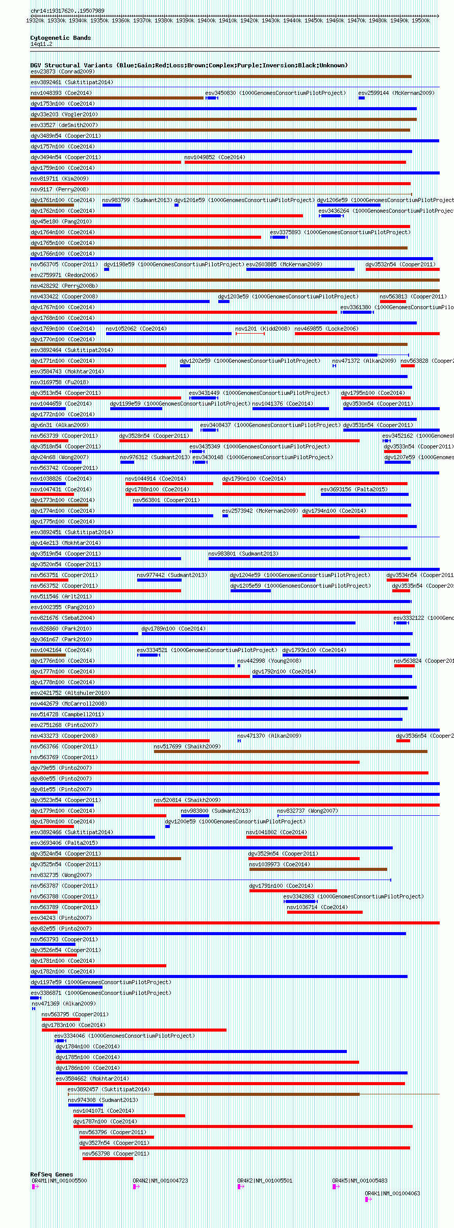 Variant DetailsVariant: essv25790043| Internal ID | 19160672 | | Landmark | | | Location Information | | | Cytoband | 14q11.2 | | Allele length | | Assembly | Allele length | | hg38 | 190370 | | hg19 | 190370 | | hg18 | 190370 |
