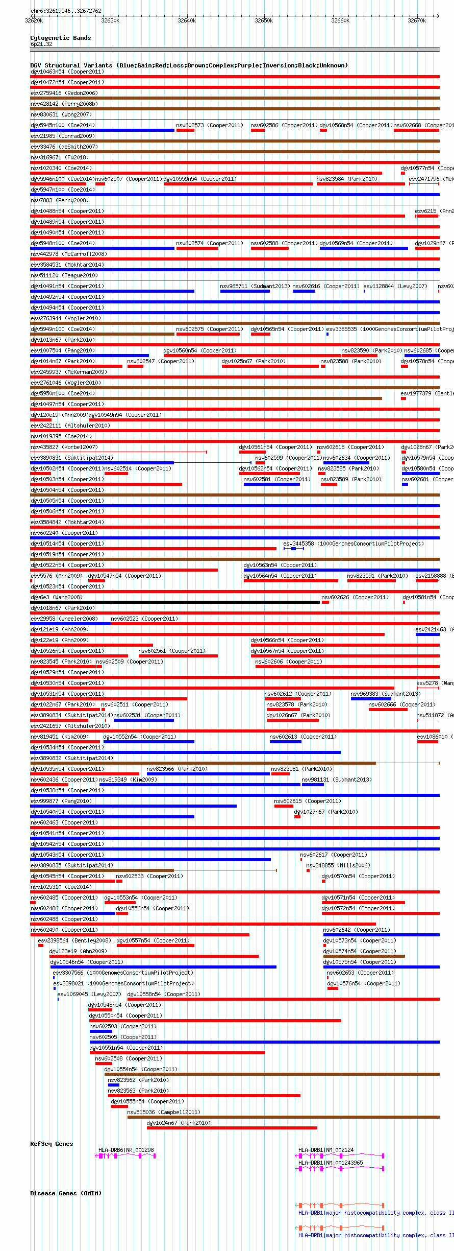 Variant DetailsVariant: essv25790190| Internal ID | 19177655 | | Landmark | | | Location Information | | | Cytoband | 6p21.32 | | Allele length | | Assembly | Allele length | | hg38 | 53217 | | hg19 | 53217 | | hg18 | 53217 |