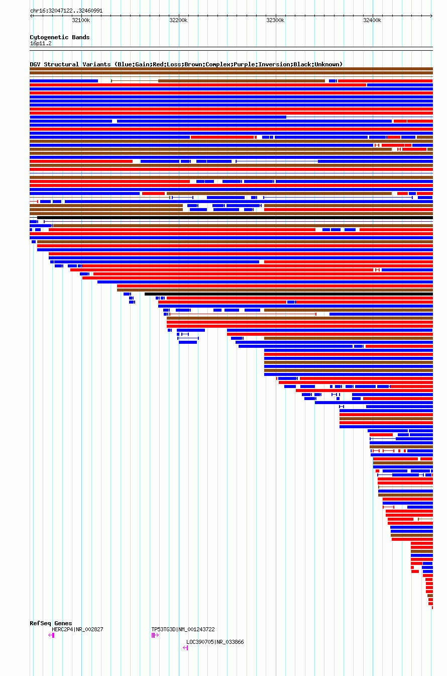 | | Variant Type | CNV gain | | Copy Number | 3 | | Allele State | | | Allele Origin | | | Probe Count | | | Validation Flag | | | Merged Status | S | | Merged Variants | esv3892833 | | Supporting Variants | | | Samples | | | Known Genes | HERC2P4, LOC390705, TP53TG3D | | Method | SNP array | | Analysis | | | Platform | Illumina HumanHap 610 | | Comments | Number of probes=161 | | Reference | Suktitipat_et_al_2014 | | Pubmed ID | 25118596 | | Accession Number(s) | essv25790204