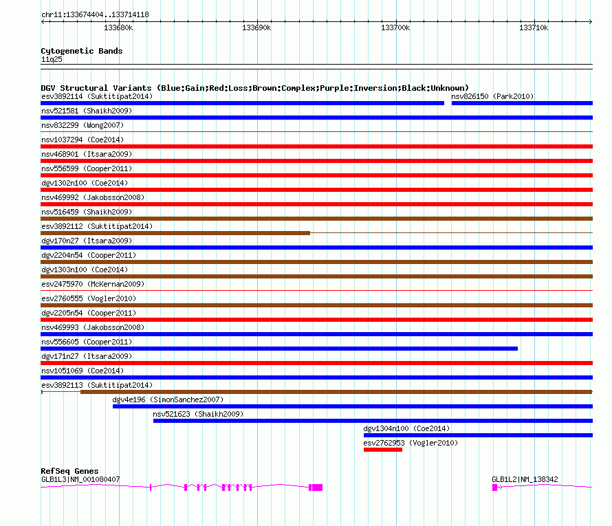 Variant DetailsVariant: essv25790311| Internal ID | 18812882 | | Landmark | | | Location Information | | | Cytoband | 11q25 | | Allele length | | Assembly | Allele length | | hg38 | 39715 | | hg19 | 39715 | | hg18 | 39715 |