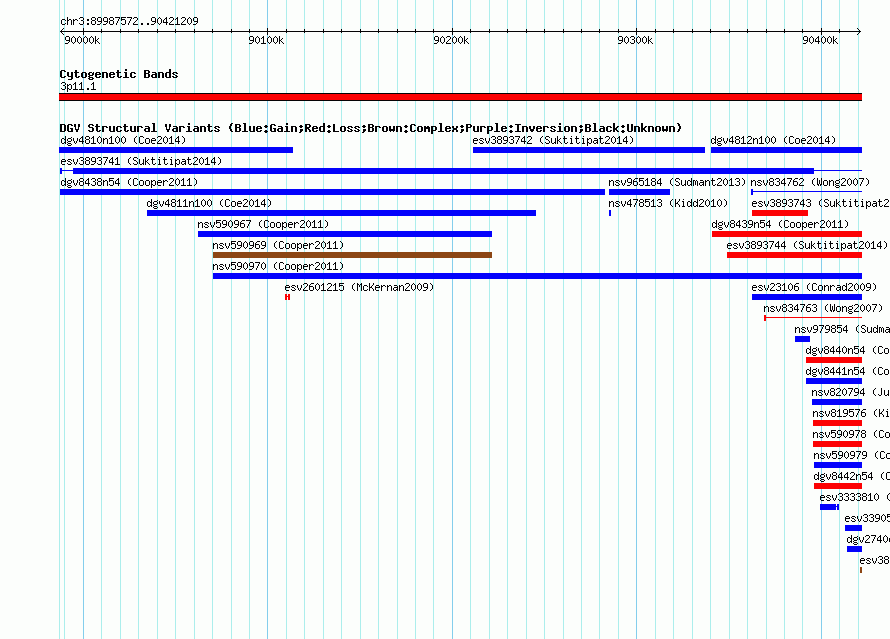 Variant DetailsVariant: essv25790359| Internal ID | 19167075 | | Landmark | | | Location Information | | | Cytoband | 3p11.1 | | Allele length | | Assembly | Allele length | | hg38 | 433638 | | hg19 | 433638 | | hg18 | 433638 |