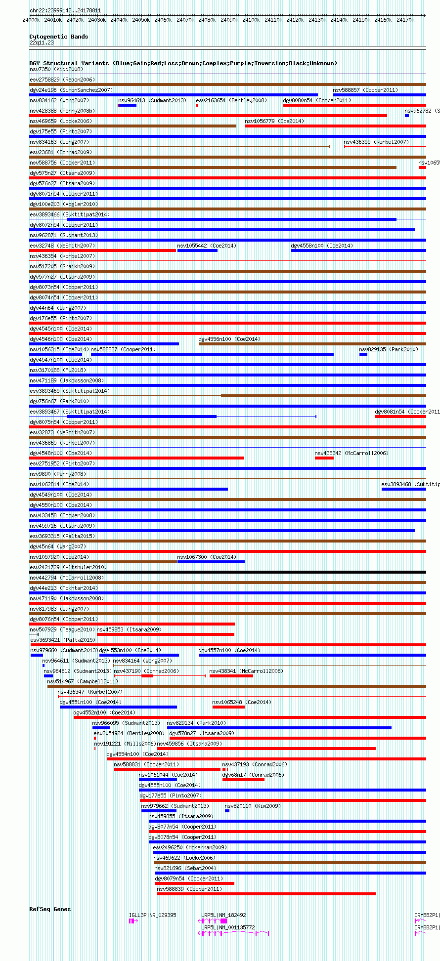 Variant DetailsVariant: essv25790494| Internal ID | 19159556 | | Landmark | | | Location Information | | | Cytoband | 22q11.23 | | Allele length | | Assembly | Allele length | | hg38 | 179670 | | hg19 | 179670 | | hg18 | 179670 |